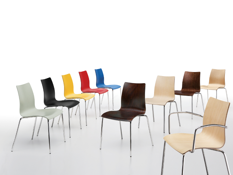 Frame steel tube diam. mm.18 or steel rod diam. mm.11. Beechwood or oak shell laquered. (The dimensions indicated refer to the chair with 4 legs frame).